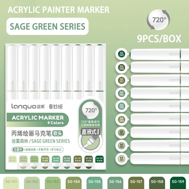 Languo 9pcs soft brush acrylic markers for DIY hand-drawn paint art projects.