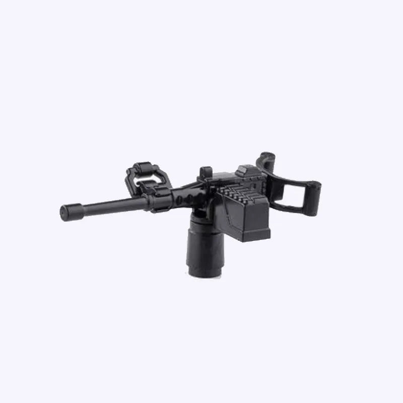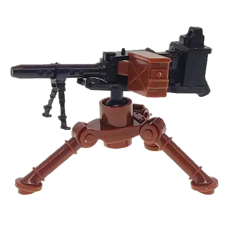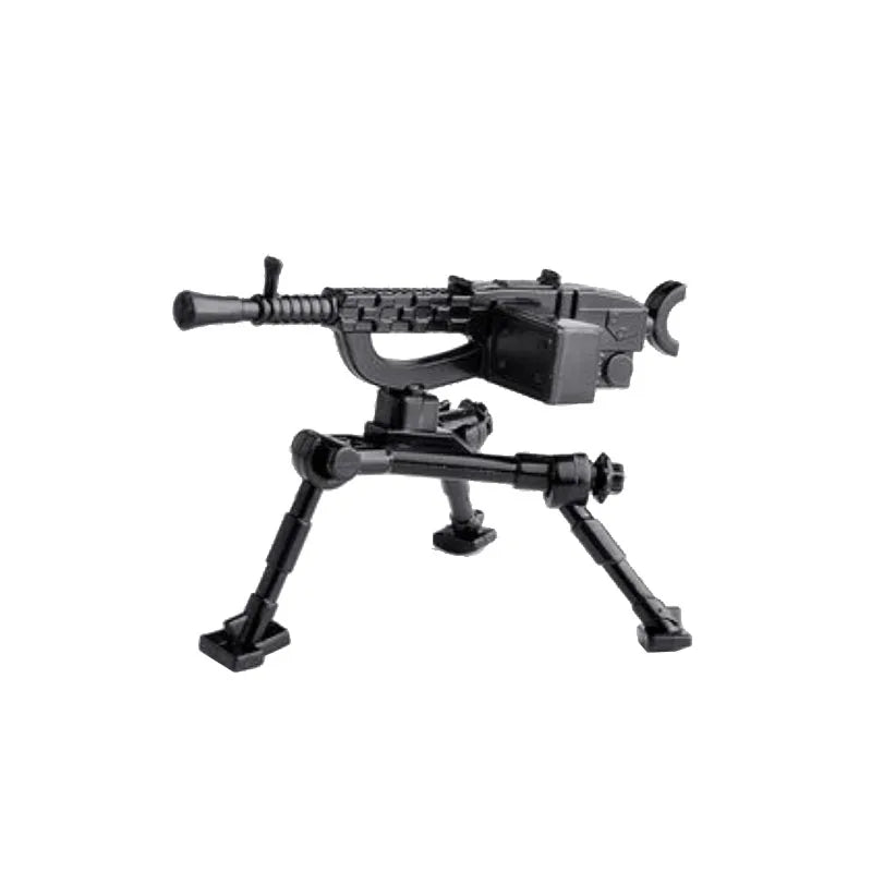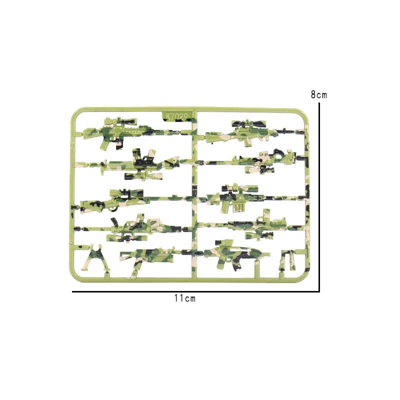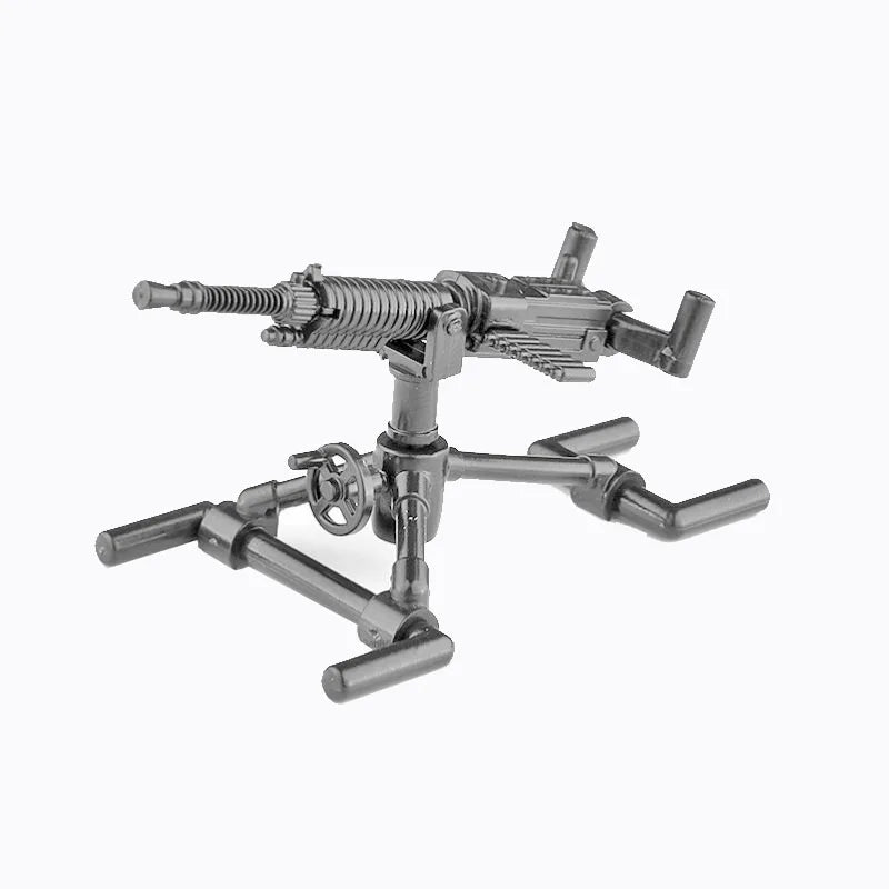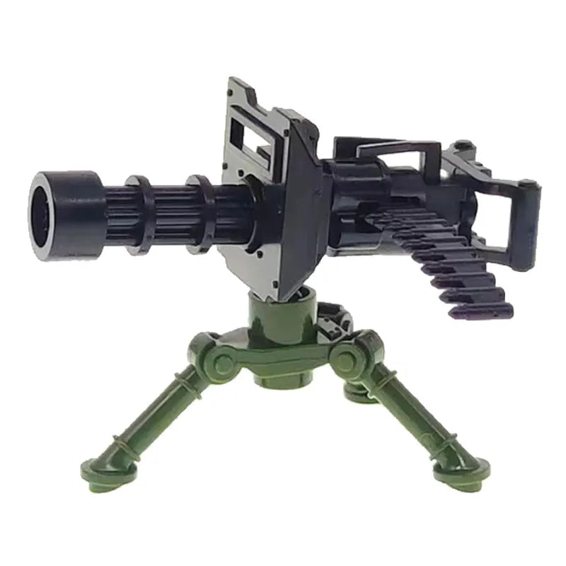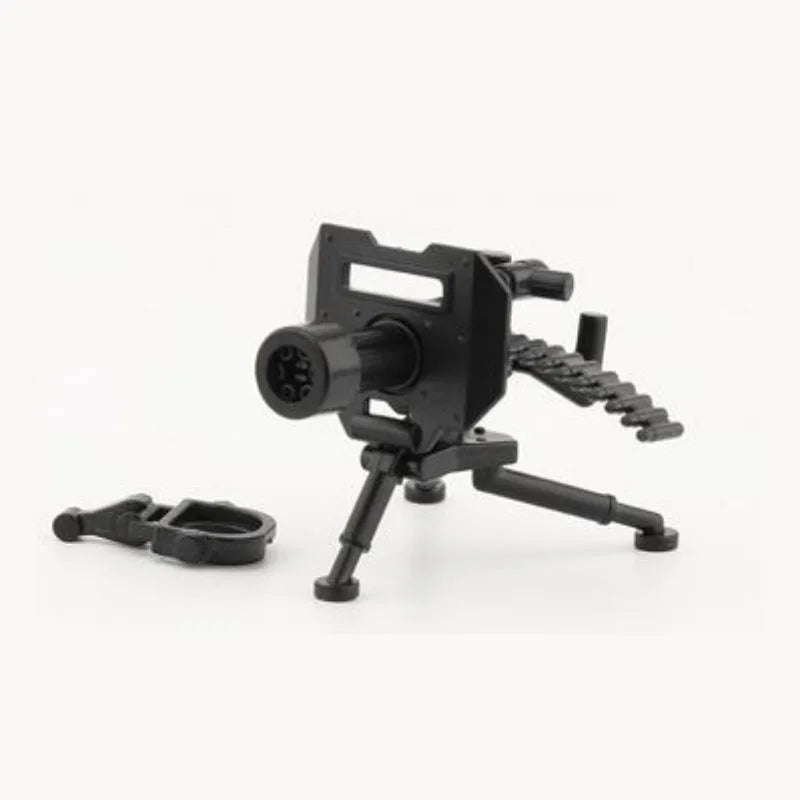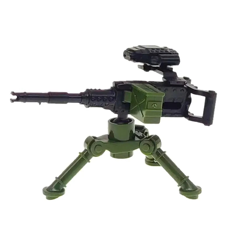 The set features a 4.5 cm soldier figure equipped with a heavy machine gun model, a mortar, a Gatling gun toy, and a toy rifle, creating a complete military-themed assembly kit.