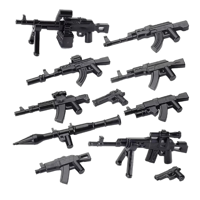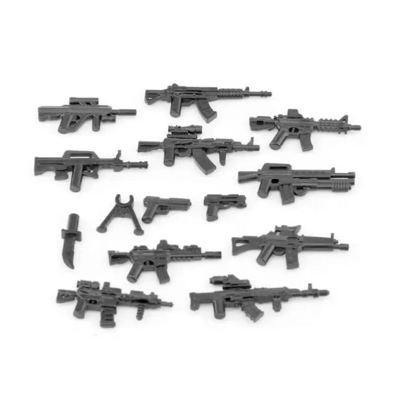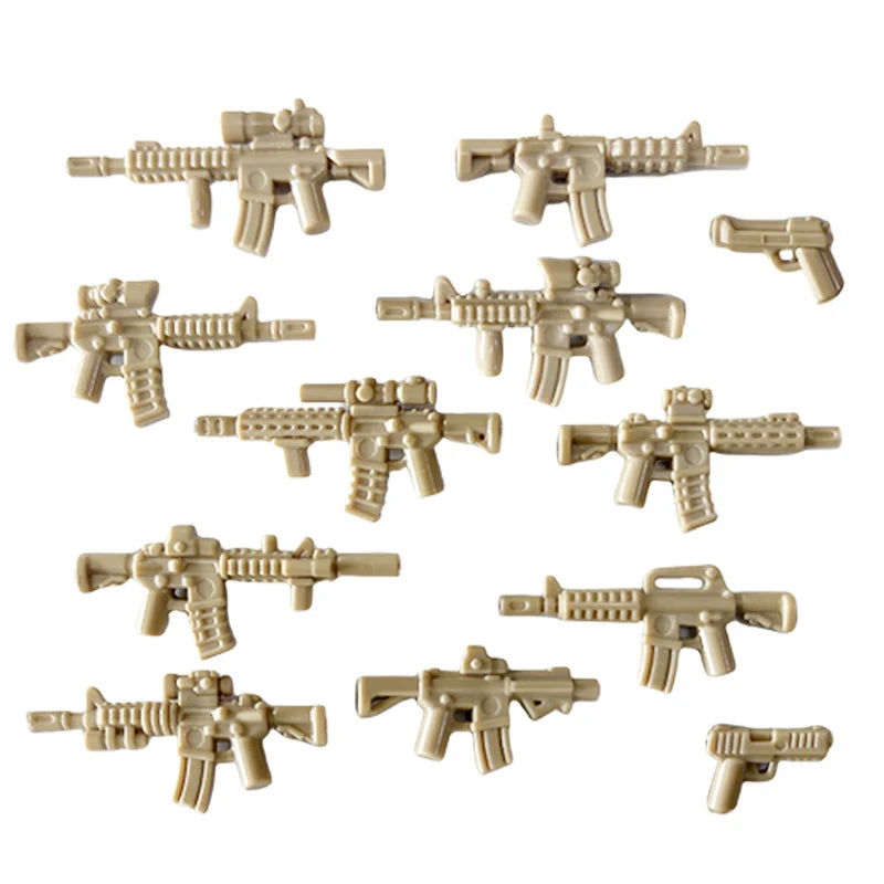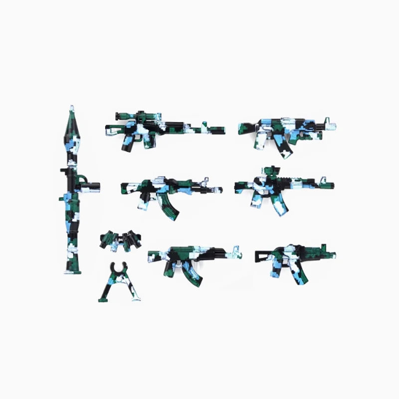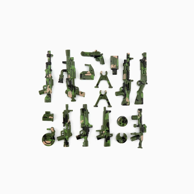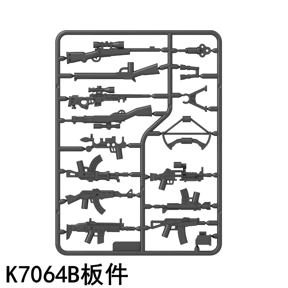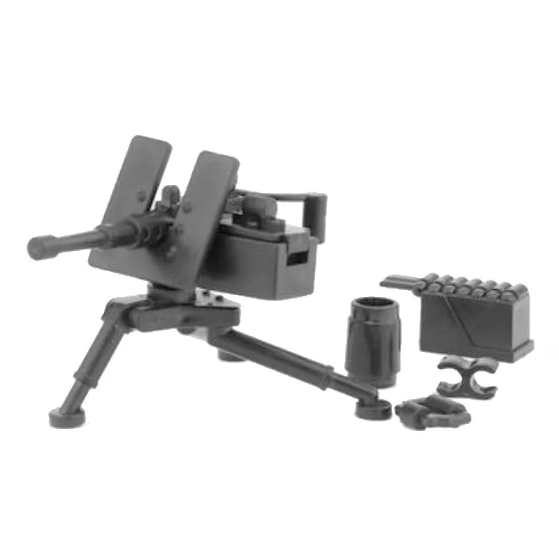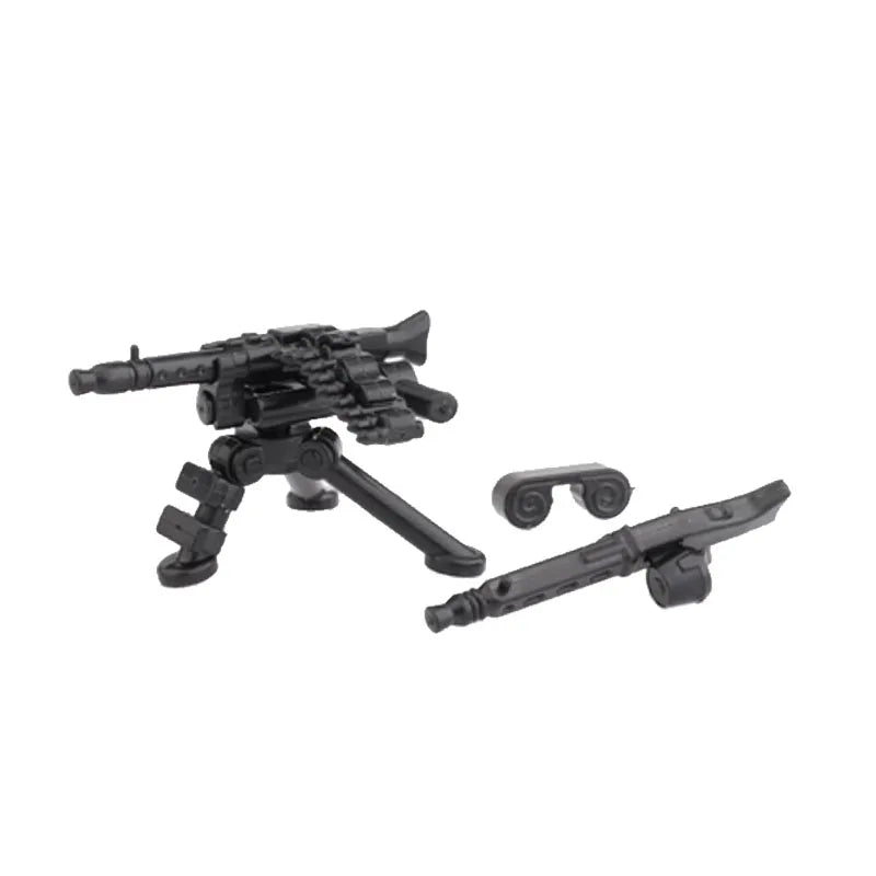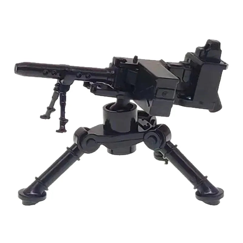 The set features a 4.5 cm soldier figure equipped with a heavy machine gun model, a mortar, a Gatling gun toy, and a toy rifle, creating a complete military-themed assembly kit.