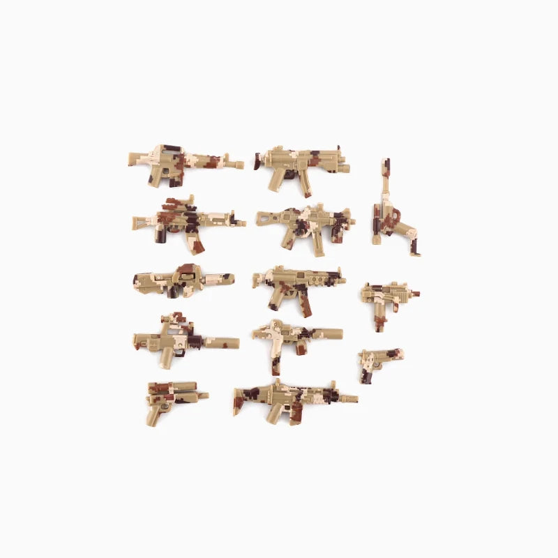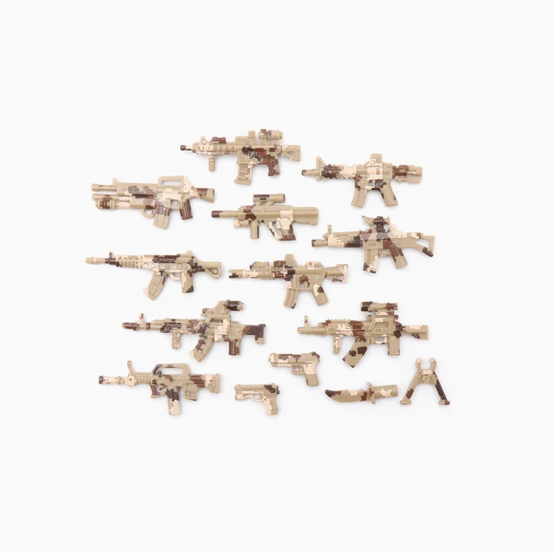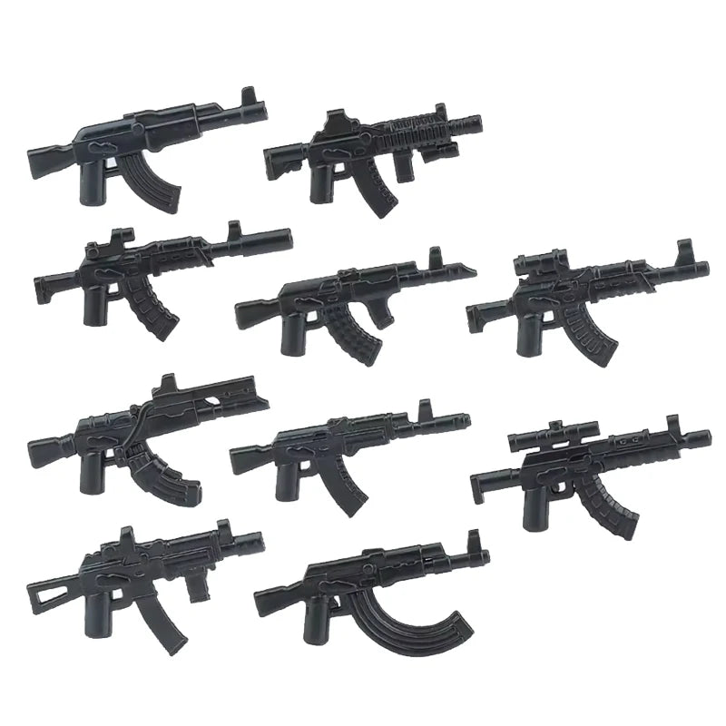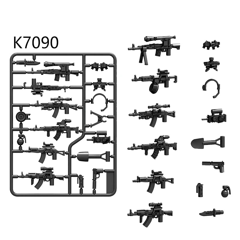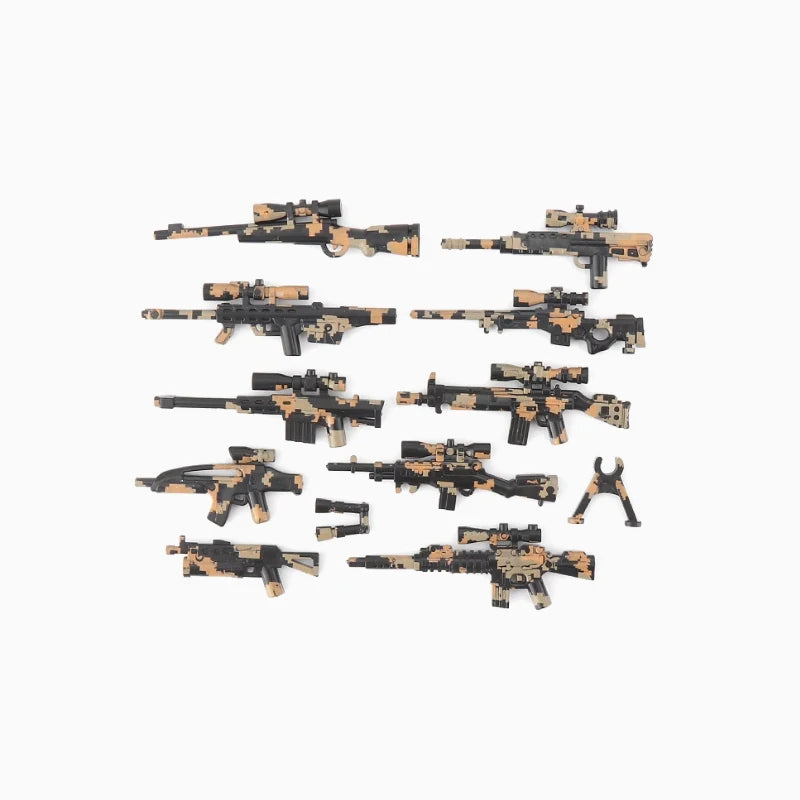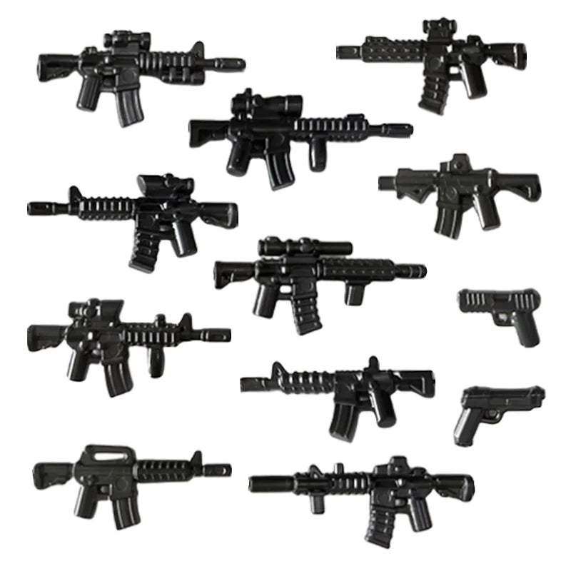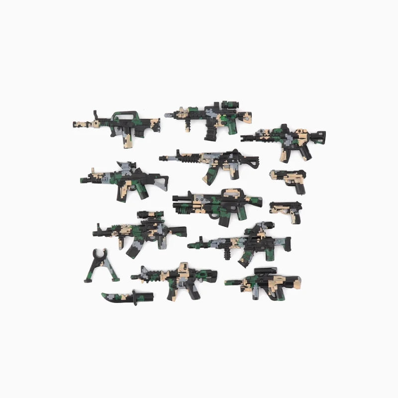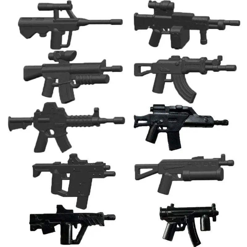 The set features a 4.5 cm soldier figure equipped with a heavy machine gun model, a mortar, a Gatling gun toy, and a toy rifle, creating a complete military-themed assembly kit.