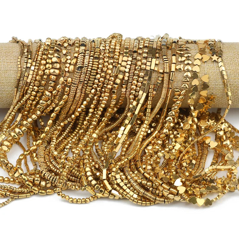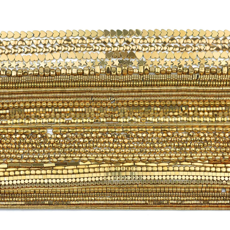 These beads are crafted from natural hematite stone and feature a gold plated finish that offers a rich, vibrant golden hue.