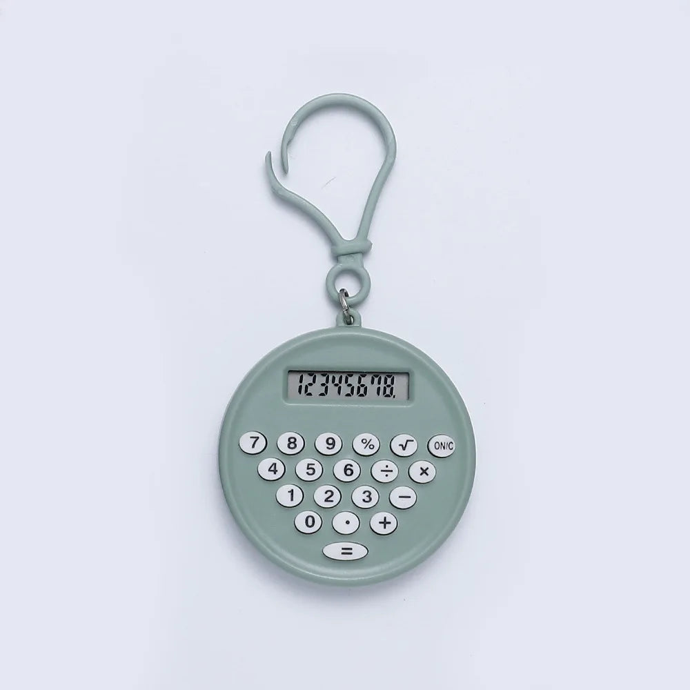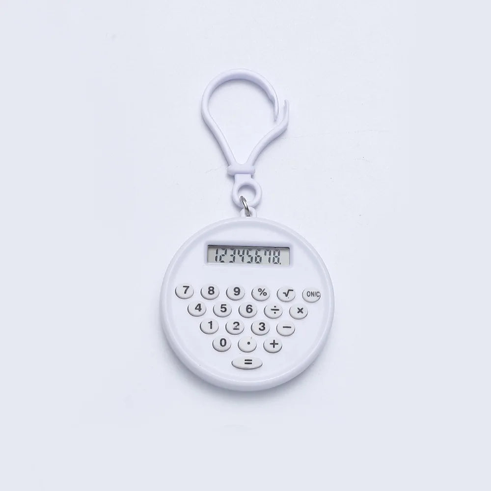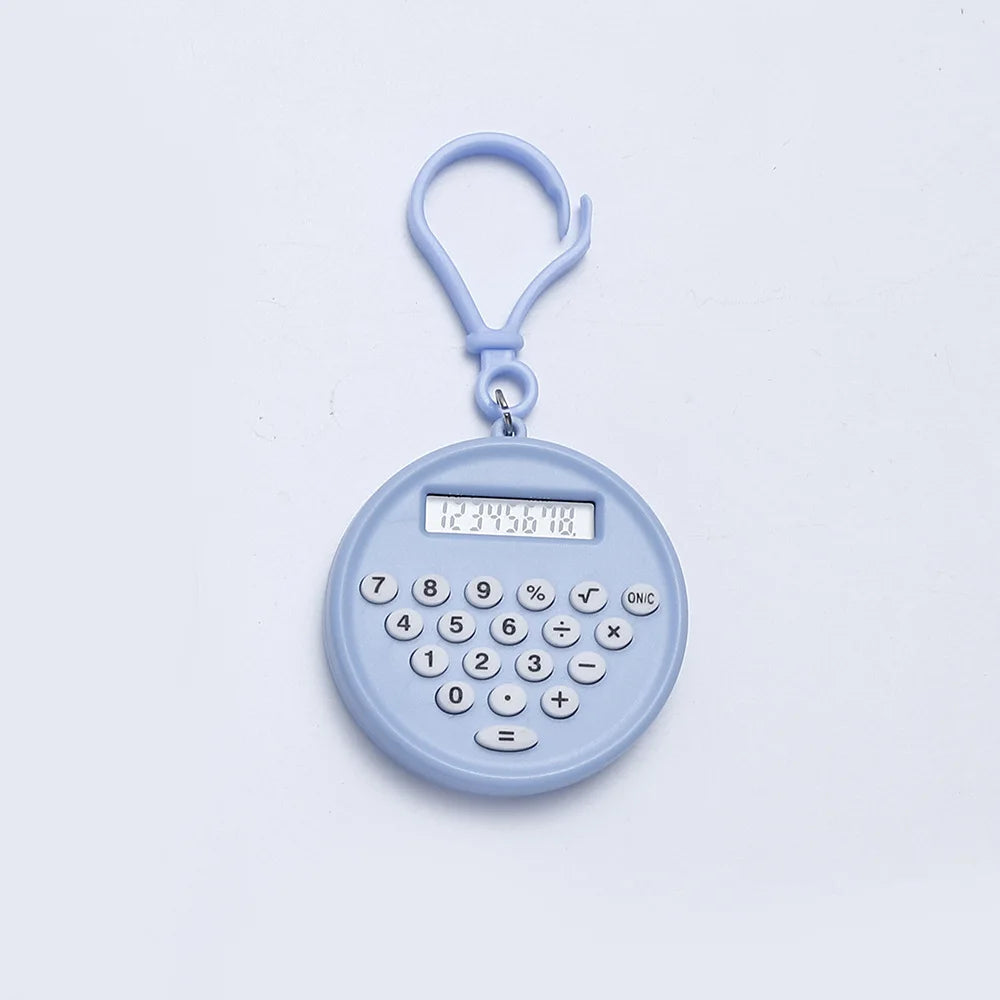 Compact silent round calculator keychain with 8-digit display for quick math and accounting.