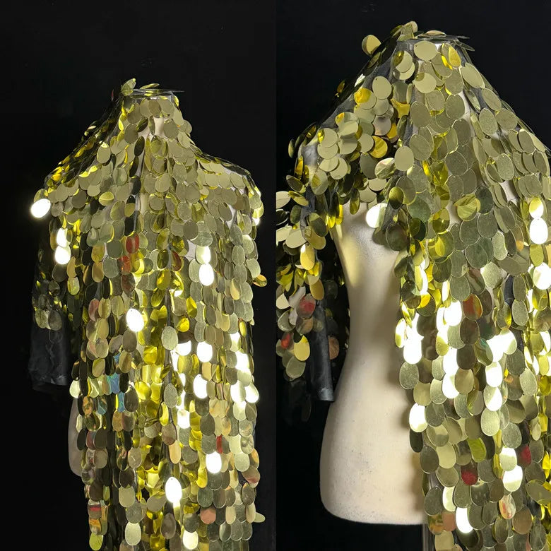 The fabric is designed to be both durable and flexible, allowing it to drape effortlessly while maintaining its striking oval sequin pattern.